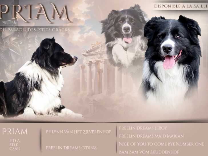 Priam est inscrit au LOF, testé et radiographié des hanches et coudes. Il n'est pas porteur de merle. Il est issu de lignées de sport et de beauté. Il ne fait pas de troupeau (sa mère en faisait).