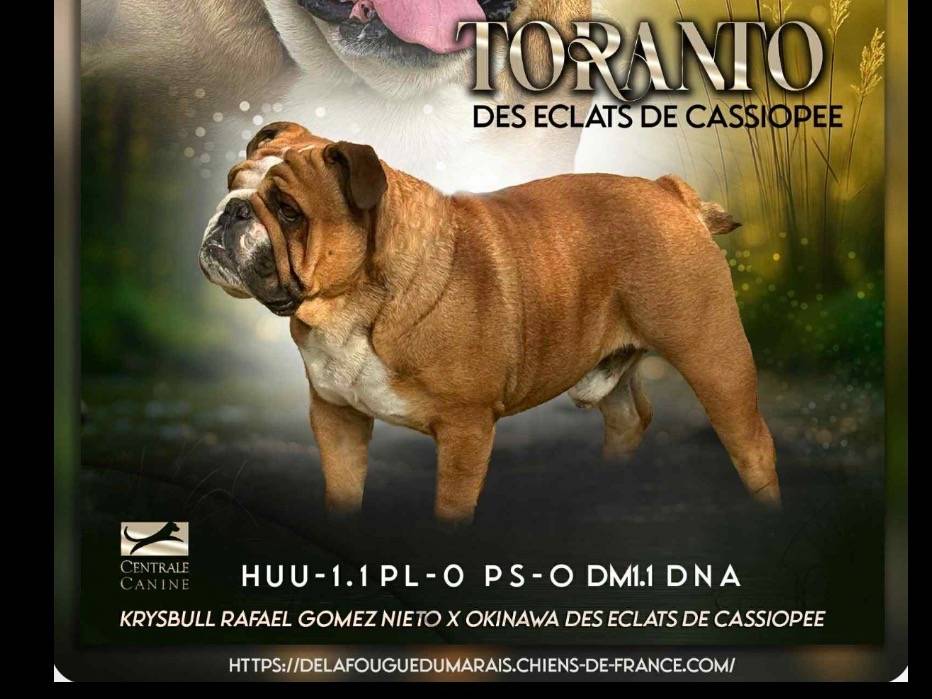 Toronto des Éclats de Cassiope, mâle Bouledogue Anglais, est disponible pour saillie. Il est né le 24 mai 2022. Il pèse 27 kg.
