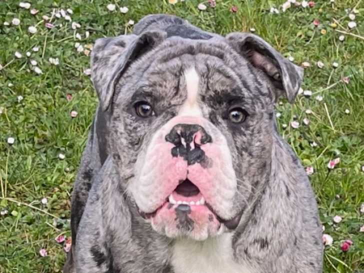 Notre beau Stan, Bouledogue Anglais de couleur merle bleu, est né le 1er septembre 2021. Il cherche une jolie blonde, il est prêt à devenir papa ! ????