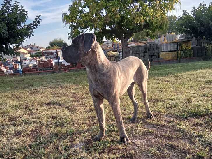 Groot, jeune Cane Corso bringé (inscrit au LOF sous le nom de Tigris des Gardiens de Cebenna), est disponible pour saillie.