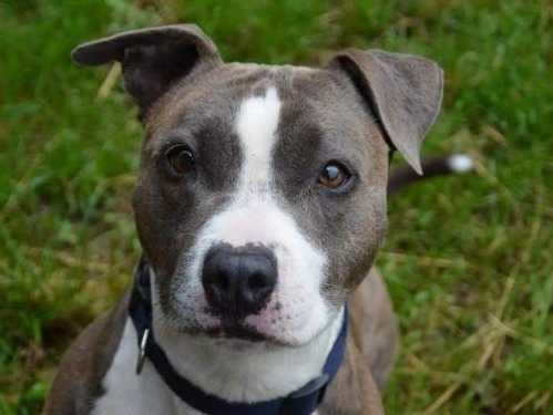 Fazer est un superbe chien croisé Boxer à la robe grise et blanche. Il est né en 2014 et ses propriétaires sont venus l’abandonner au refuge. Il est très gentil avec les bénévoles.