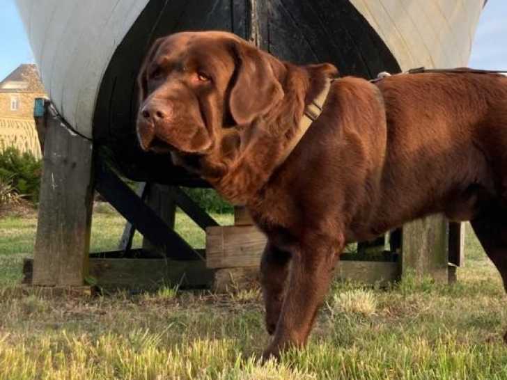 C'est un Labrador chocolat de 3 ans et demi, inscrit au LOF et de grande lignée. Il provient de l'élevage réputé du Moulin de Sault, qui produit des Labradors équilibrés de gros gabarit.