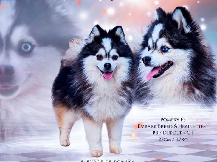 J'ai un magnifique Pomsky d'élevage, type F3, âgé de 1 an. Il est de couleur noir et blanc, avec un masque de lys. Il a le poil polaire et des yeux bleu très clair. Il pèse actuellement 12,3 kilos. Il est en...