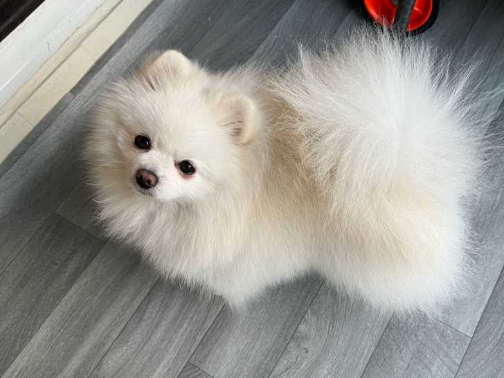 Je propose mon magnifique Spitz Nain blanc pour saillie. Il est inscrit au LOF et il est confirmé. Il s'appelle Bijou. Il pèse 2,1 kg et mesure 23 cm au garrot.
