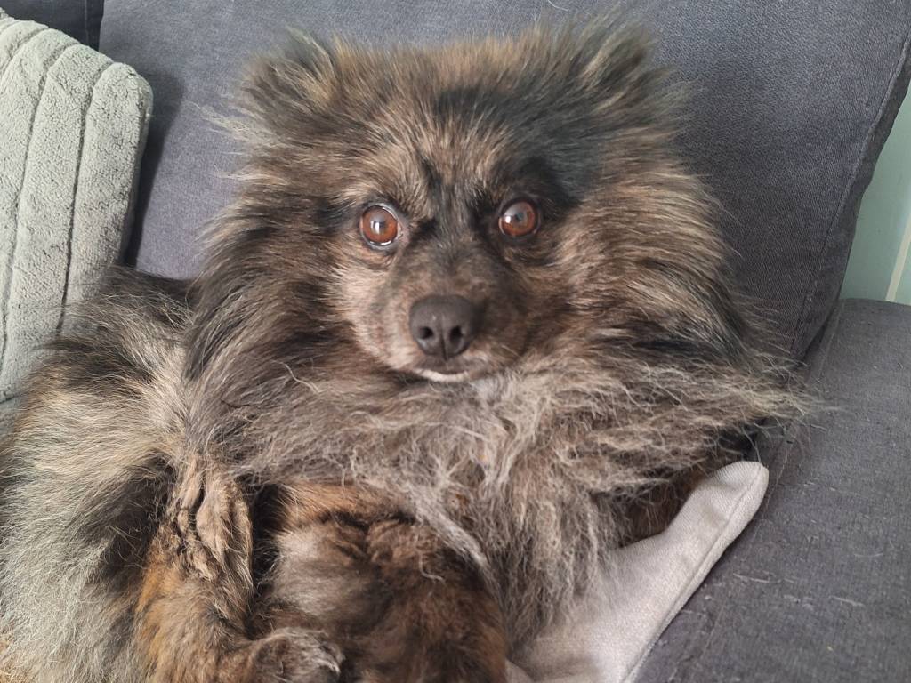 Snow est un Loulou de Poméranie de couleur lavande (rare), mélange de noir, gris et marron.
