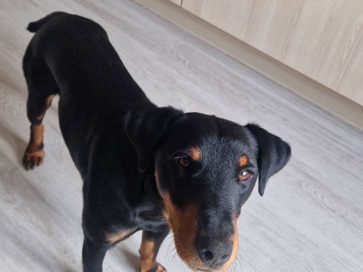 Il a le poil lisse, de couleur noir et feu. Il pèse 14 kg environ.
