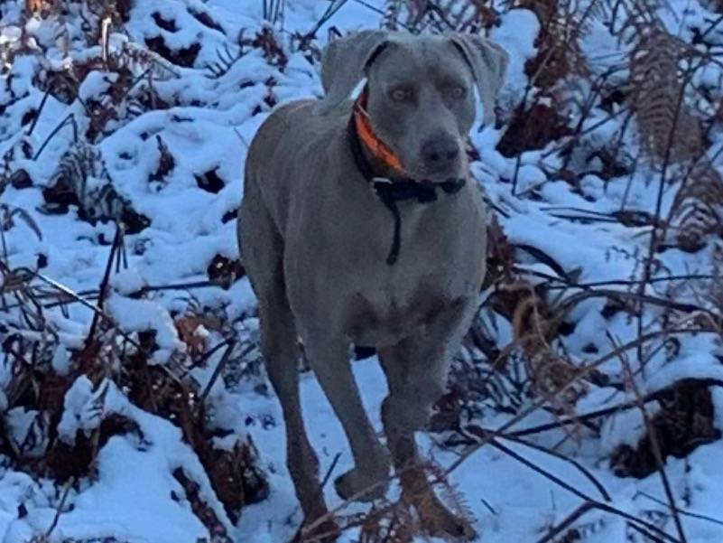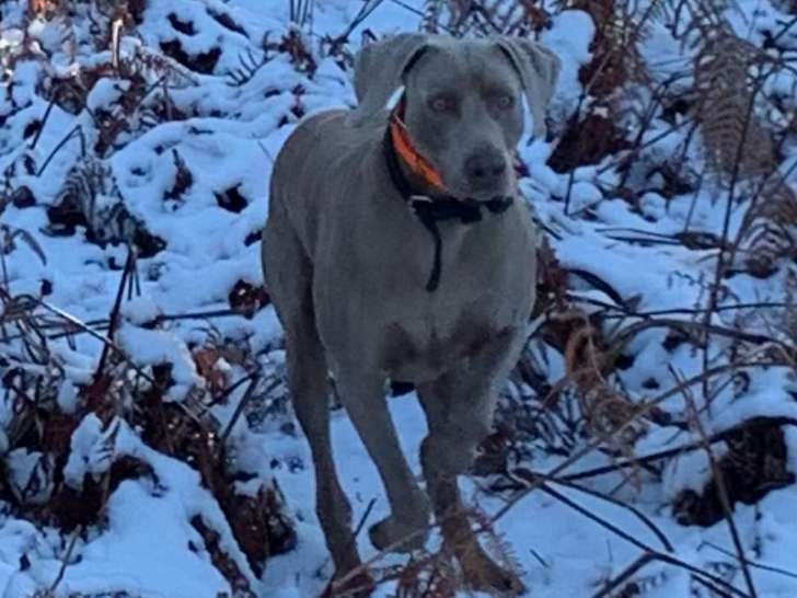 C'est un chien qui a pas mal chassé, surtout la bécasse. Il a beaucoup de nez. Il est d'un gros gabarit, il pèse environ 40-45 kg. Il n'est pas inscrit au LOF, mais ses deux parents sont des Braques de Weimar.