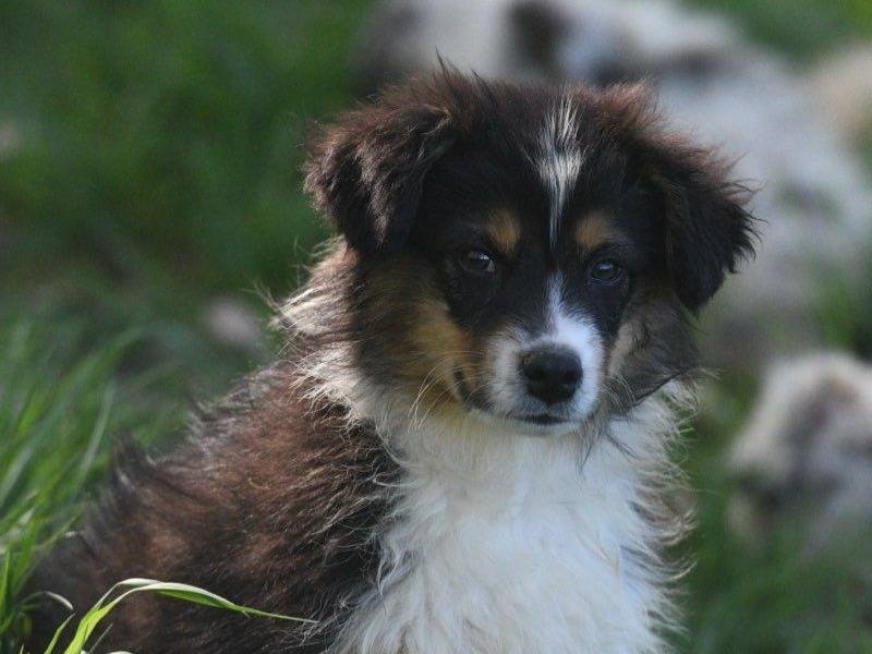 Parmi les femelles, une chiot noir tricolore à queue longue est disponible. Du côté des mâles, on trouve un chiot noir tricolore à queue courte ainsi qu'un chiot noir tricolore à queue longue. La portée comprend également deux mâles bleu merle à queue longue et une femelle bleu merle à queue longue.