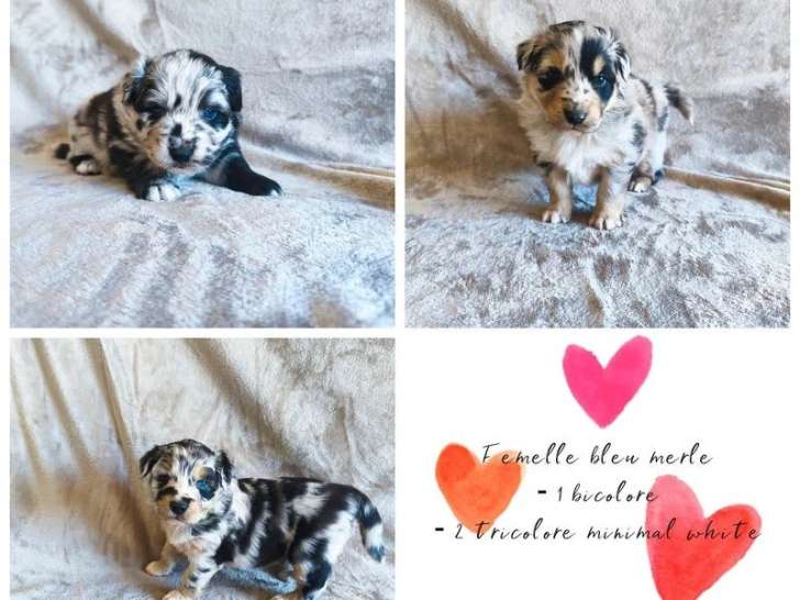 La portée se compose de six femelles et deux mâles. Les chiots bleu merle sont proposés au prix de 1 200 euros chacun, la femelle bleu merle bicolore également à 1 200 euros, et les chiots noirs tricolores et bicolores à 900 euros chacun. Une femelle noire bicolore, non conforme aux standards de couleur en raison d'un fessier légèrement gris fumé sur les pointes, est proposée à 600 euros et part non inscrite au LOF. Les parents sont inscrits au LOF et testés, visibles sur place.