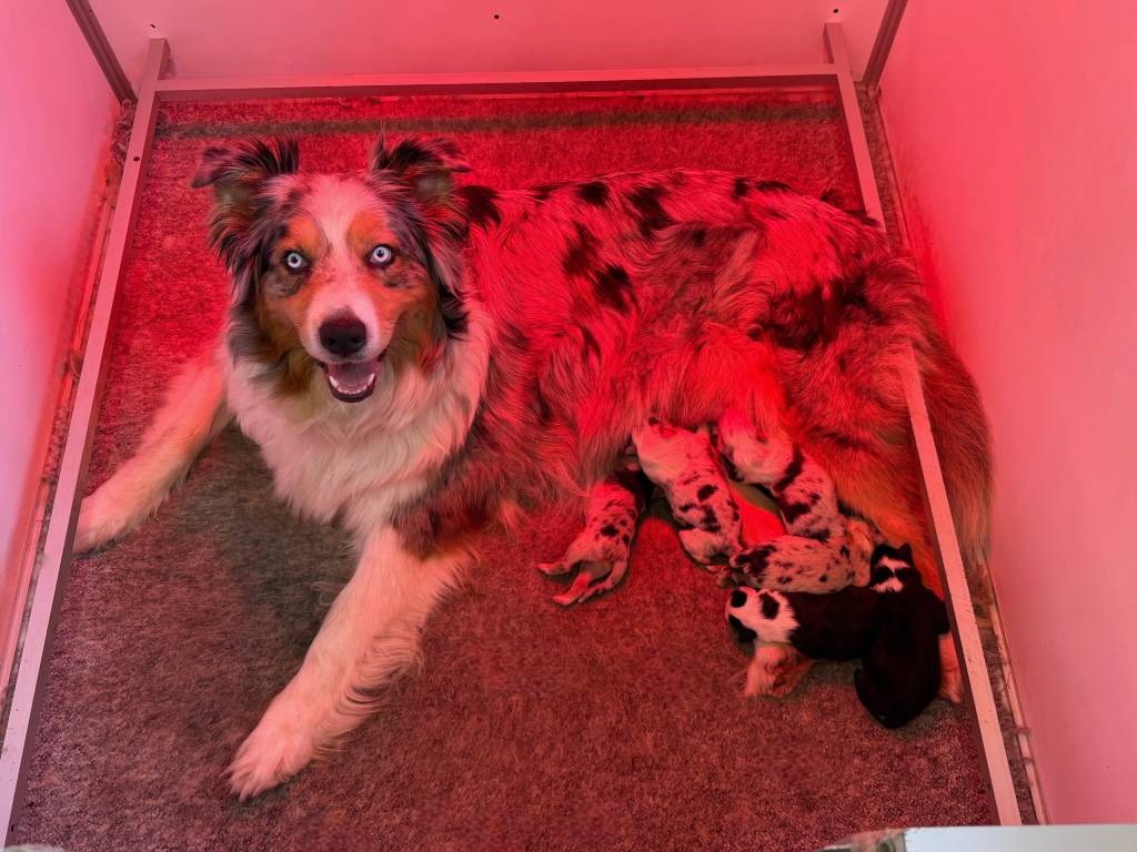 Couleurs des chiots: Bleus merles et noirs tricolores.