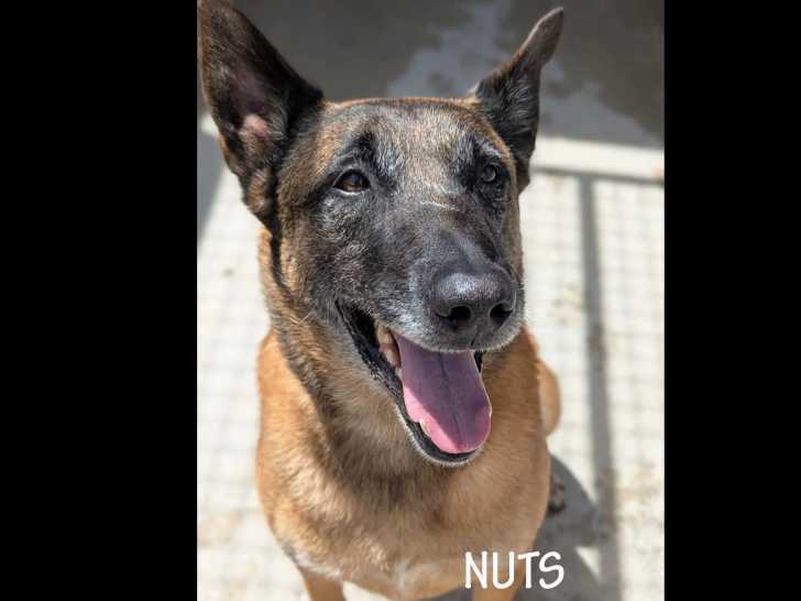 Nous mettons disponible à l'adoption ce chien Berger Malinois de couleur fauve charbonnée et âgé de sept ans nommé Nuts. Il est proche de l’humain et recherche un foyer prêt à lui offrir une belle vie.