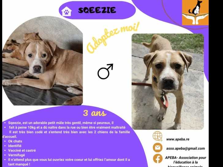 Squeezie est un chien Royal Bourbon à la fourrure beige de trois ans que nous sommes ravis de vous proposer à l'adoption. Il s’entend aussi bien avec ses congénères qu’avec des chats.