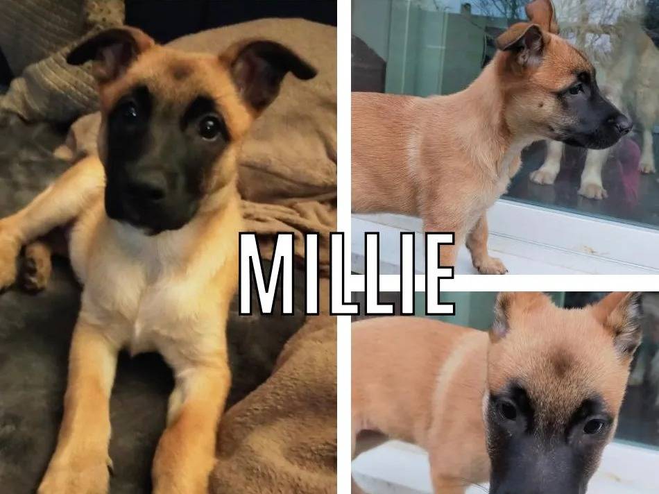 Nous vous présentons Millie, un chiot femelle Berger Malinois au pelage fauve âgée de deux mois, pleine de vie et d’enthousiasme, proche des humains, à l’aise avec enfants, chats et chiens, curieuse et dynamique.