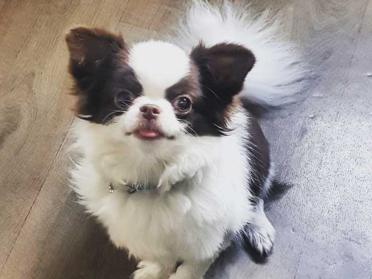 Je suis Peps un magnifique Chihuahua âgé de 1 an. Je porte un beau smoking long de couleur blanc et chocolat.