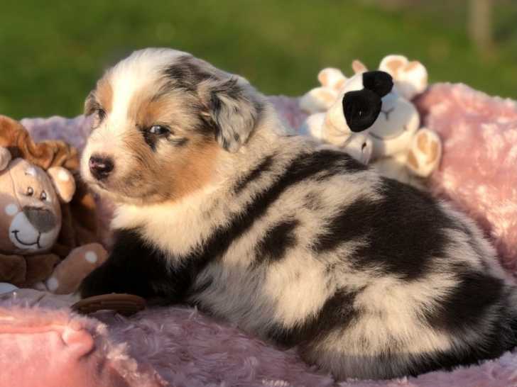 Sur une portée de huit chiots Berger Australien, nous proposons à la réservation deux mâles ainsi que deux femelles. L'un des mâles et l'une des femelles ont chacun un pelage tricolore tandis que les deux autres sont de couleur bleu merle. Le tarif varie en fonction du sexe et de la couleur : 1200, 1300, 1700 ou 1800 euros.