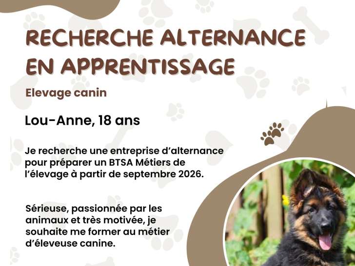 Sérieuse, motivée et désireuse d’apprendre, je souhaite intégrer un élevage canin pour développer mes compétences pratiques et découvrir le métier sur le terrain : soins aux animaux, alimentation, entretien des espaces, suivi de l’élevage et accompagnement au quotidien.