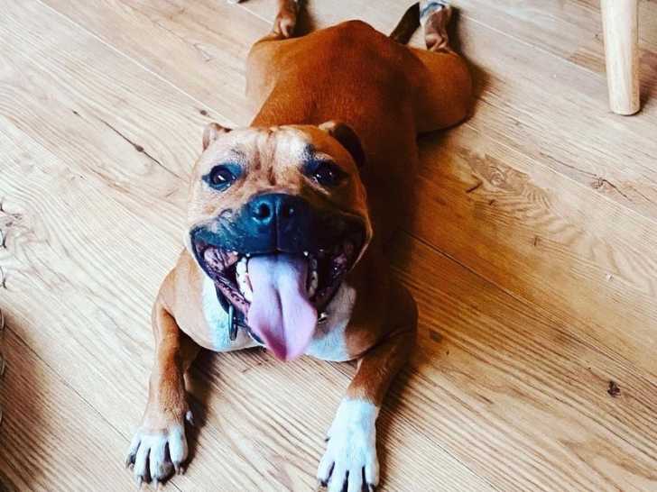 Elle a le caractère typique du Staffie, elle est très sociable et en pleine santé. Elle pèse un peu plus 15 kg.