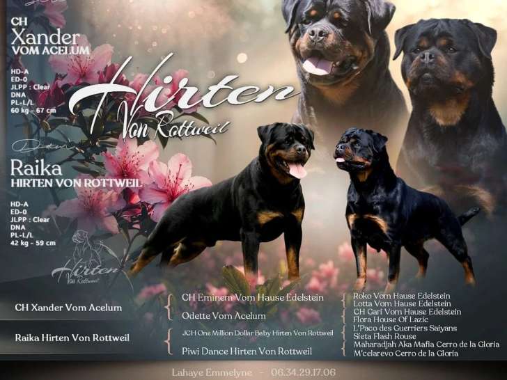 L'élevage Hirten Von Rottweil propose de réserver des chiots Rottweiler inscrits au Livre des Origines Français (LOF), issus de l'union de deux reproducteurs soigneusement sélectionnés.