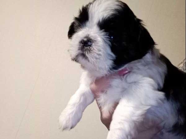 Nous vous proposons de réserver des chiots Shih Tzus nés le 28 février 2022 : un mâle tricolore vendu à 1300 euros et une femelle noire et blanche vendue à 1400 euros.