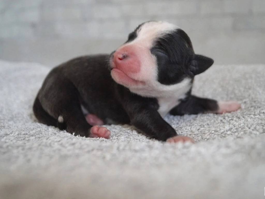 Notre centre d’élevage situé à angivillers a accueilli une portée de six chiots le 23 février dernier. Parmi eux, ce mâle American Staffordshire Terrier attire déjà l’attention par son dessin bringé pan blanc, net et harmonieux. Âgé de 4 jours, il évolue sereinement auprès de sa mère Papel et de son père Tell Me More t-bag, tous deux visibles à l’élevage et confirmés.