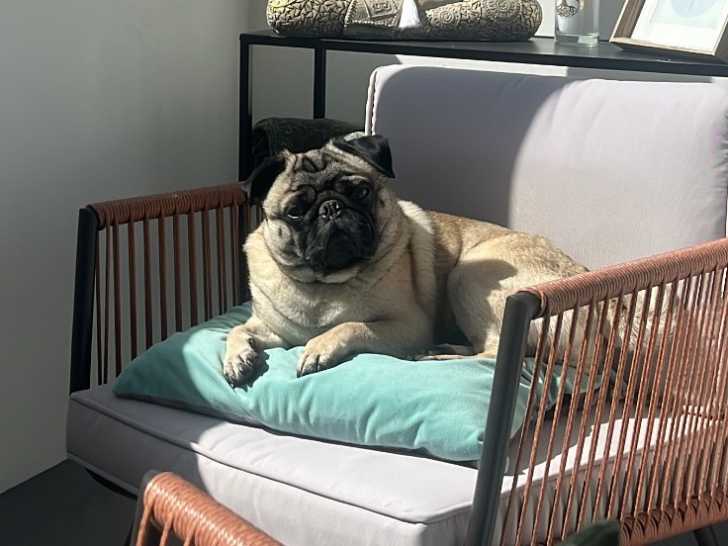 Issu de lignées sélectionnées pour leur conformité au standard de la race, Roméo possède une morphologie harmonieuse, un bon port de tête, et un masque bien marqué typique du Carlin. Sa respiration est fluide, ses articulations solides, et il n’a jamais présenté de problème de santé, ce qui est un vrai plus pour cette race.