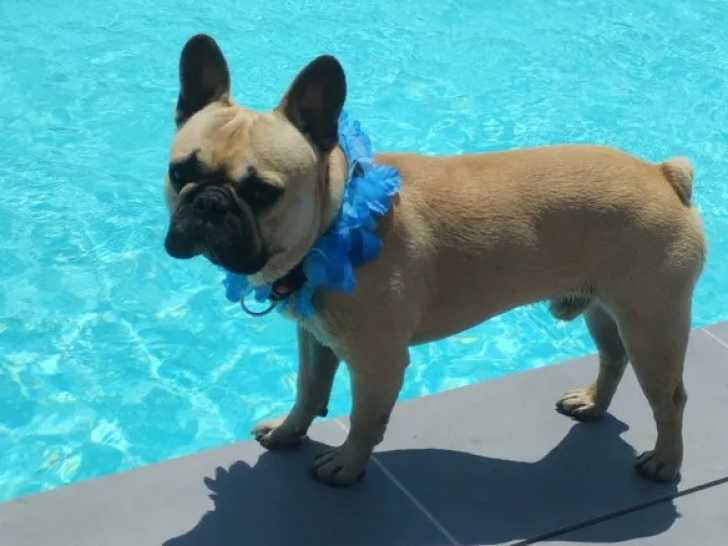 Il est très câlin et joueur, et il adore les promenades. Il est de gabarit normal : il pèse 15,60 kg, ce n'est donc pas un petit Bouledogue. Il est fauve avec une cravate blanche.