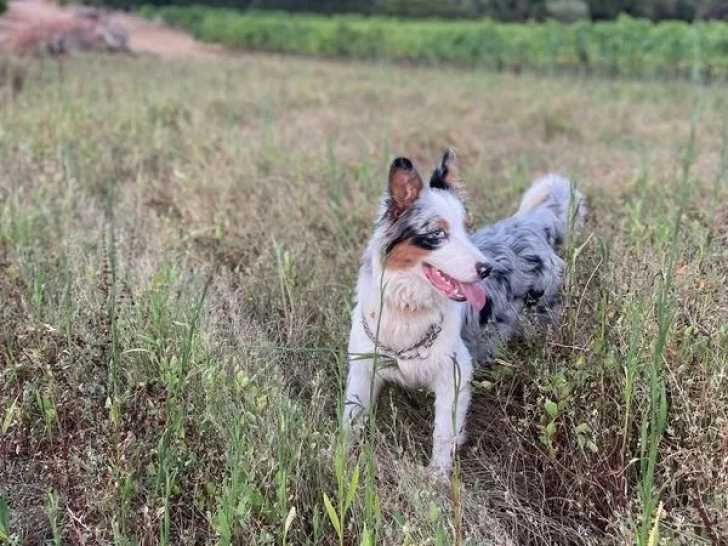 Arès, un chiot mâle Berger Australien né le 26 janvier 2025, proposé à la vente.Bleu merle aux yeux bleus, il est inscrit au Livre des Origines Français (LOF) et testé génétiquement. Son prix est de 300 euros.