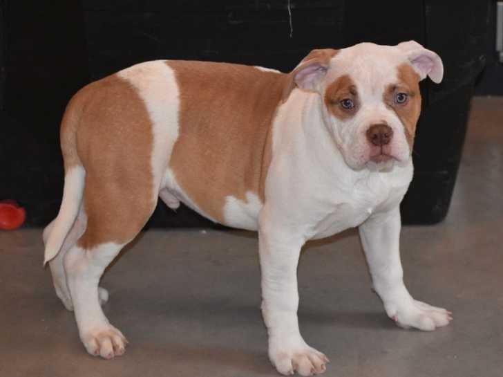 Avec son pelage blanc et marron, nous mettons en vente ce beau mâle de race Bouledogue Américain pour le prix de 1095 euros.