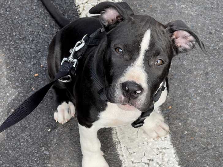 Suite à un déménagement professionnel, nous devons malheureusement nous séparer en urgence de notre petite chienne American Staffordshire de 3 mois (née le 04/06/21) noire pan blanche, car le propriétaire de notre futur logement interdit les chiens de catégorie...