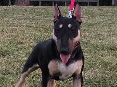 Nous mettons en vente un chiot Bull Terrier miniature né le 27 octobre 2021 dans notre élevage. Ce mâle possède un pelage noir tricolore et est inscrit dans le Livre des Origines Français (LOF).