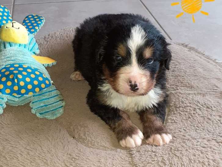 Nous avons 3 chiots Bouviers Bernois tricolores disponibles à la vente : 1 femelle et 2 mâles, tous nés le 19 mars 2022.
