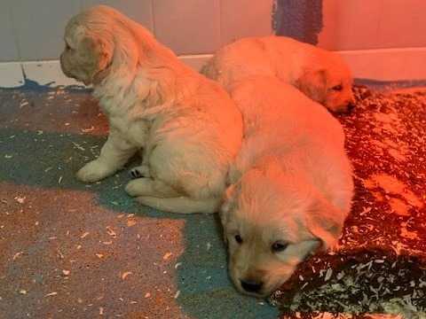 Nous avons trois chiots Golden Retrievers beiges à vendre, il s'agit de deux mâles et d'une femelle nés le 13 novembre 2021.
