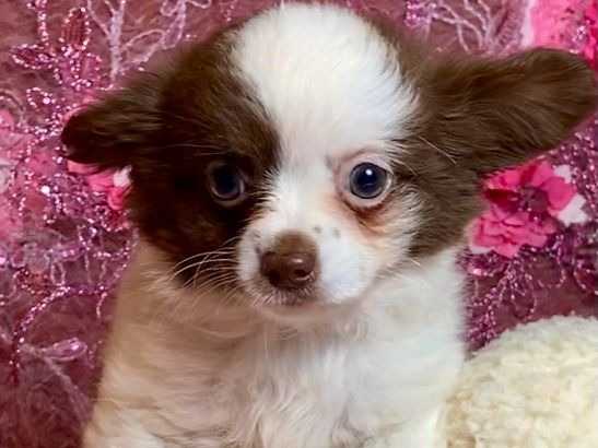 Nous mettons en vente des chiots Chihuahuas à poils longs nés le 01 février 2022. Vous avez le choix entre une femelle chocolat et blanc, une femelle chocolat merle, une femelle tricolore et un mâle chocolat et blanc.