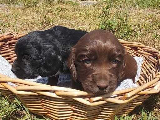 Nous avons deux chiots Cocker Anglais, nés le 06 juin 2022, qui sont disponibles à la vente : un mâle noir et une femelle marron chocolat.