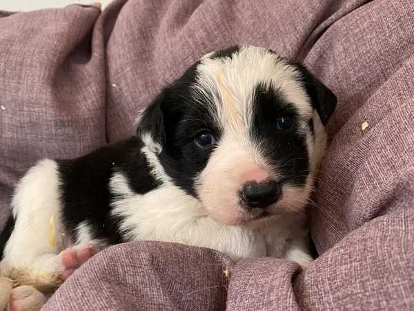 Nous mettons en vente des chiots Border Collie nés le 18 octobre 2021. Il s’agit de quatre femelles et de cinq mâles de couleur noir et blanc.