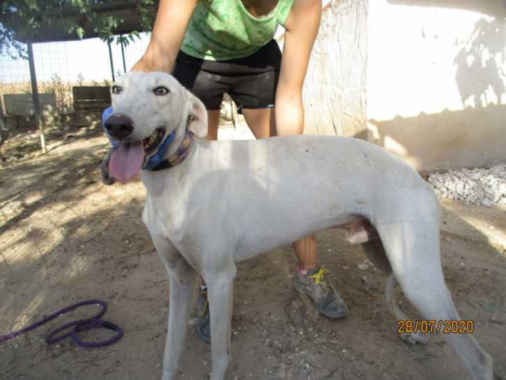 Proposé à l'adoption : Blanco, un Lévrier Espagnol de couleur blanche, né en 2015, actuellement en Espagne.