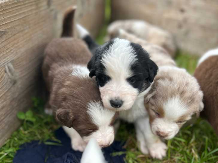 Des chiots Berger Australien Miniature nés le 7 mai 2025 au sein d'un élevage familial passionné et attentif au bien-être animal sont à vendre. Ils seront disponibles à partir du 10 juillet.