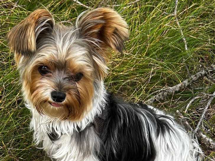 Je m'appelle Yuki, je suis un Biewer Yorkshire noir et blanc, avec une tête de couleur beige.