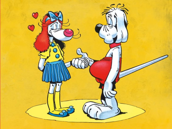 Une image de la bande dessinée « Gai-Luron » montrant Gai-Luron tenant la main à une chienne anthropomorphique