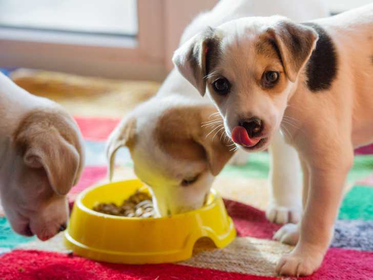 Le sevrage des chiots se termine à l'âge de 7 à 8 semaines. Les premiers mois, répartissez la ration quotidienne en 4 ou 5 repas tout au long de la journée, pour arriver à 2 repas vers l'âge d'un an. Les heures et le lieu du repas doivent être identiques chaque jour. En effet, les chiots, tout comme les chiens adultes, aiment avoir leurs habitudes. De plus, cela leur permet de réguler leur tube digestif. Un bol d'eau fraîche doit toujours être à leur disposition.
