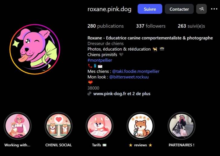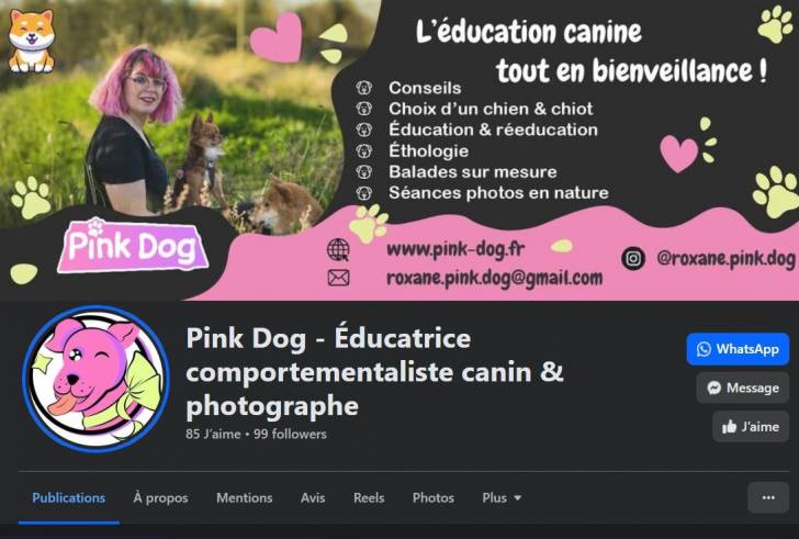 Bonjour ! Je m’appelle Roxane Lasseur et vis à Montpellier, dans le sud de la France. Depuis 2022, j’exerce les activités d’éducatrice canine comportementaliste et de photographe de chiens. Mon entreprise a pour nom Pink Dog.