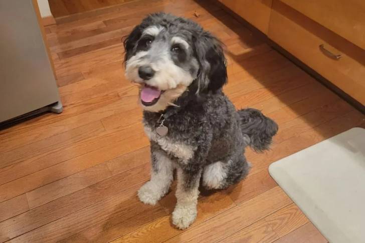 Un Woodle assis sur un plancher et portant un collier autour du cou
