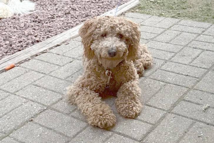 Un Woodle allongé sur un sol pavé et portant un collier autour du cou