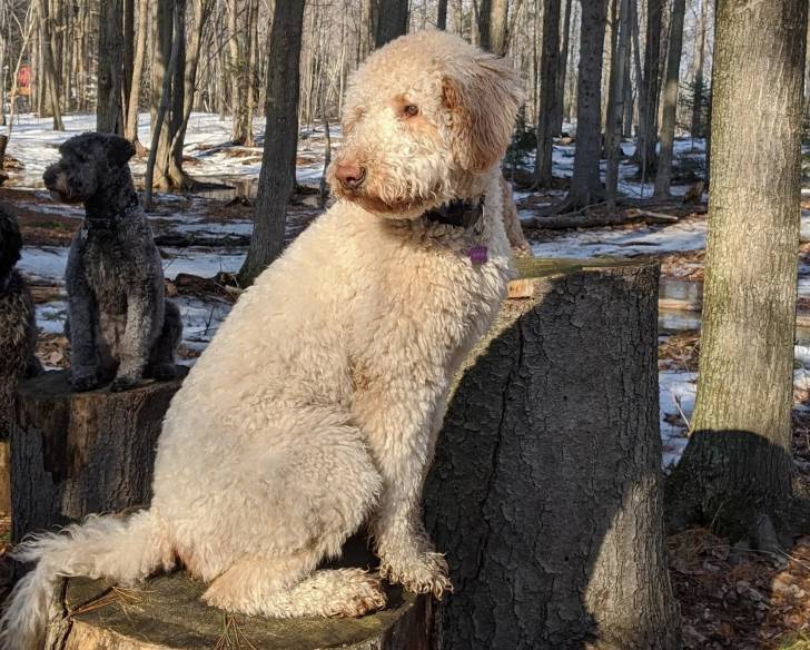 Un Woodle assis sur un tronc d'arbre et portant un collier autour du cou