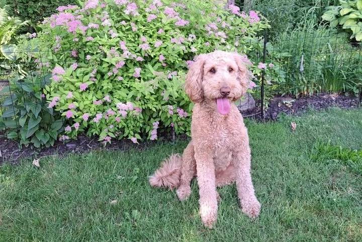 Un Woodle assis sur une surface gazonnée et ayant la langue pendante