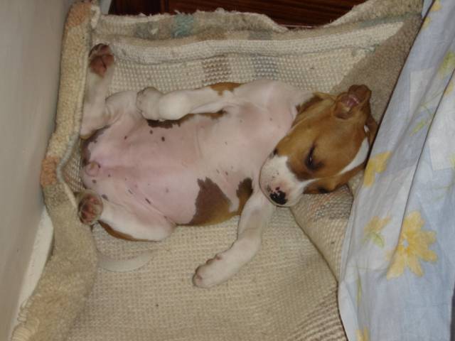 Maya, pit bull de deux mois entrain de dormir
