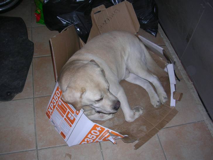 Bob mon chien ,prend un carton et il se mes decu je l'adore mon chien