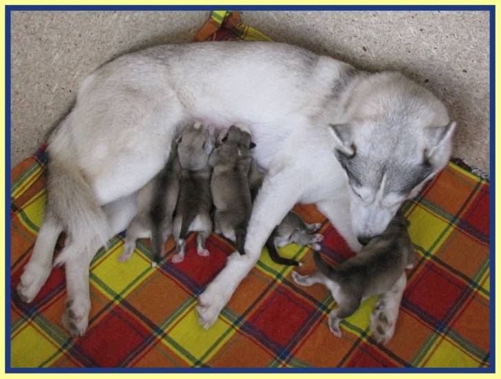 voilà ma chienne Elka avec sa première portée !!nous sommes content du résultat il y a 5 magnifique chiots !3 males et 2 femelles nous cherchons des noms pour les petits !