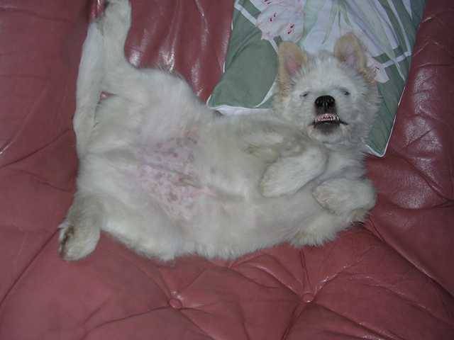 3 mois le 02 mars 05, tout blanc, les oreilles rousses. Blanc comme son Montagne des Pyrennées de son père et roux comme sa maman.