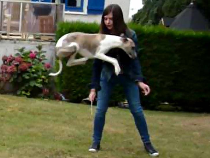 Mon chien qui fait des prouesses en agility ! (c'est moi sur la photo) Peut être que vous ne le voyez pas mais j'ai une barre dans la main et je le fait sauter au dessus. Regarder la marge impressionnante ! :p
